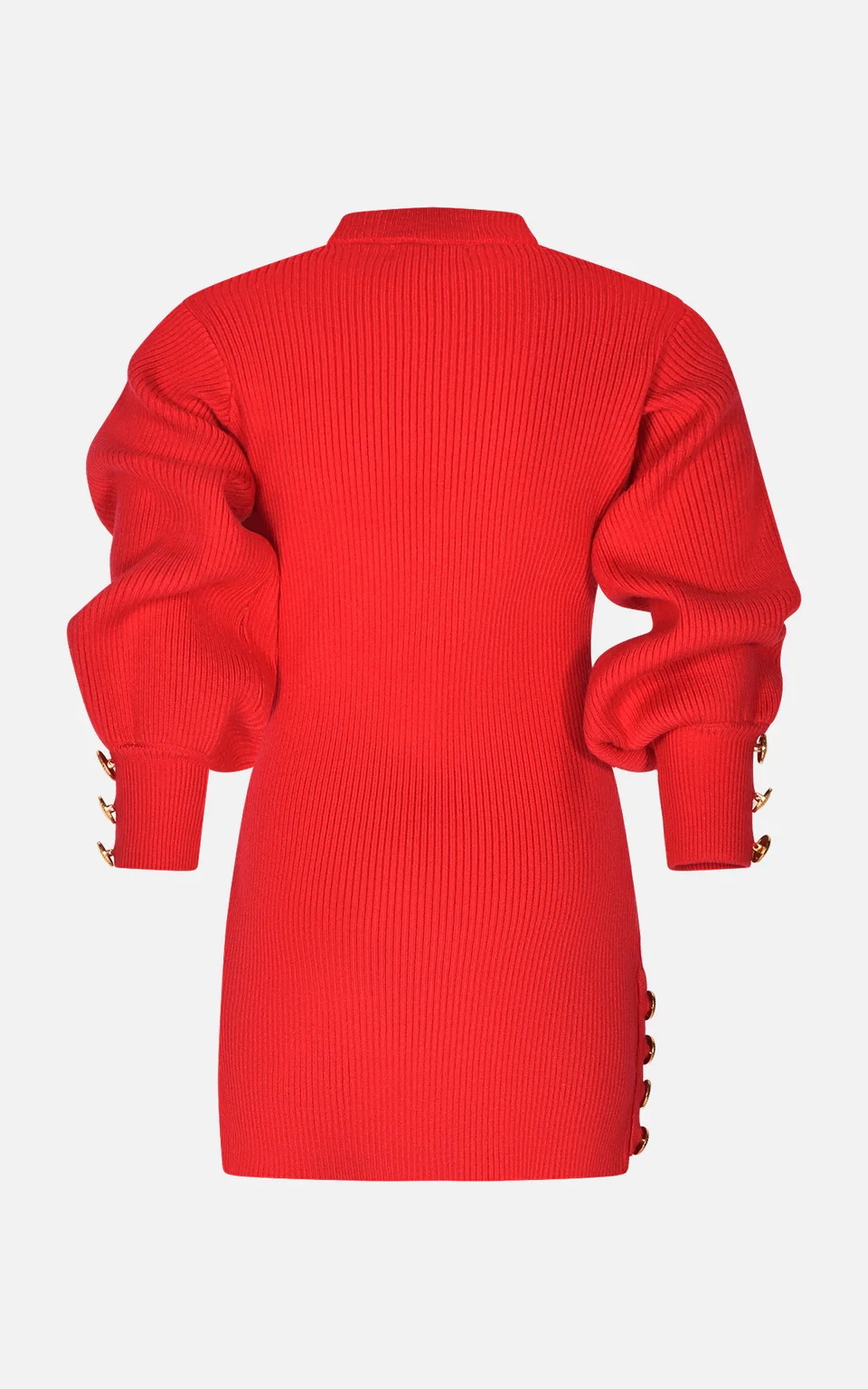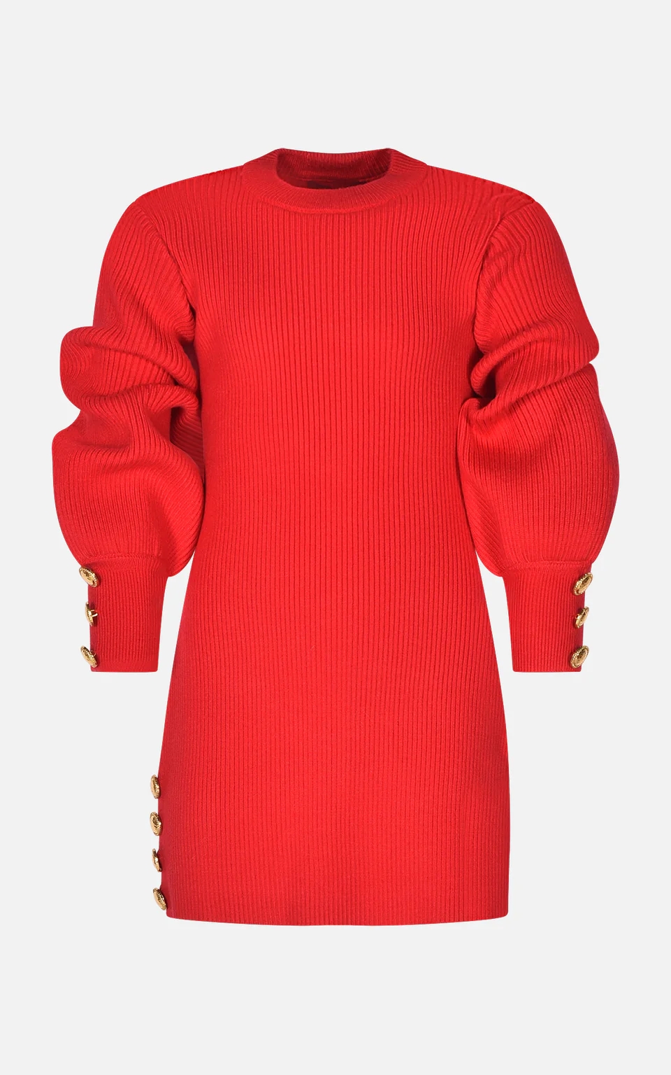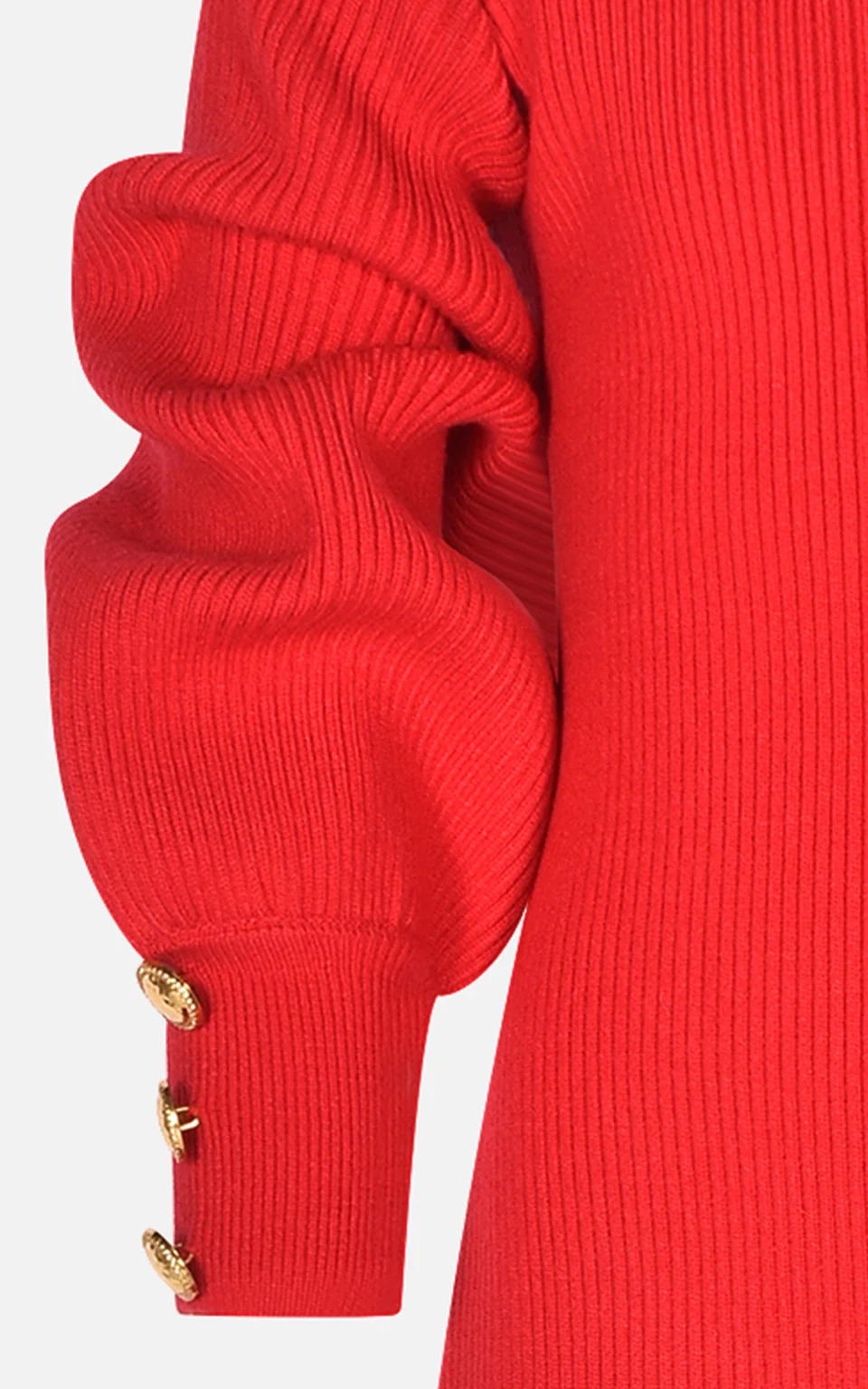Vestito in maglia a coste con collo rotondo e maniche lunghe. Lato destro con spacchetto al fondo e bottoni oro funzionali. Polso fondo manica con bottoni decorativi oro.