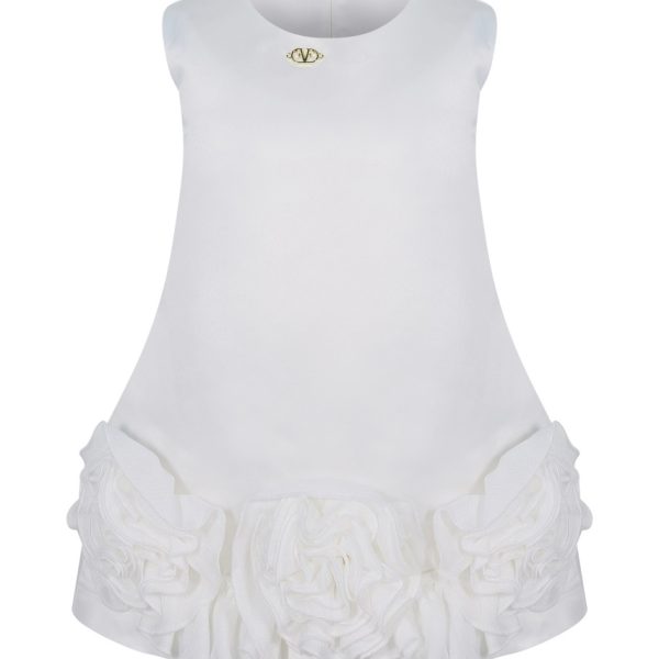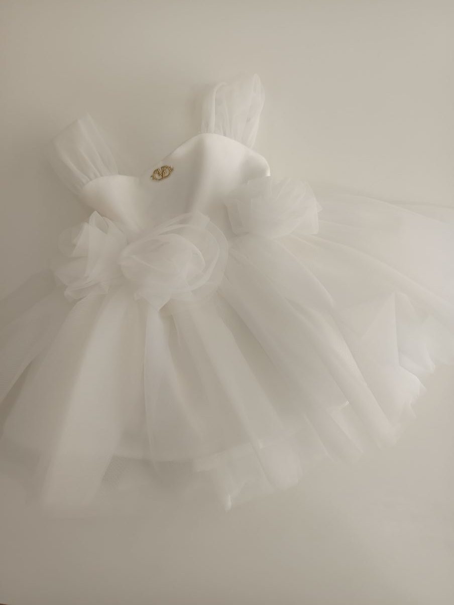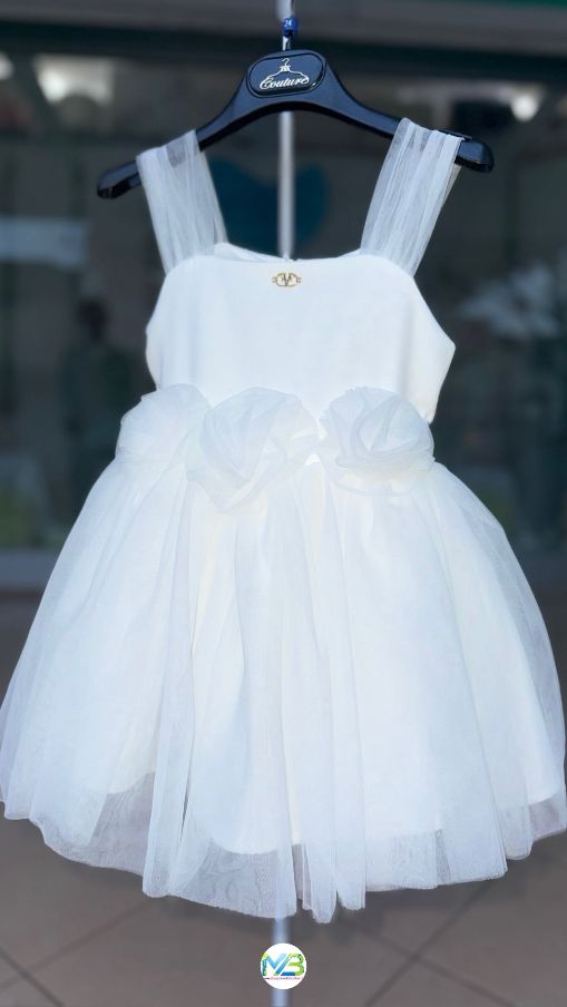 Abito elegante di tulle colore bianco con fiori sulla vita