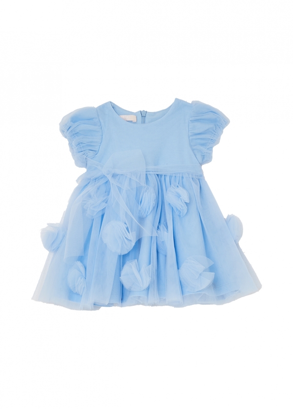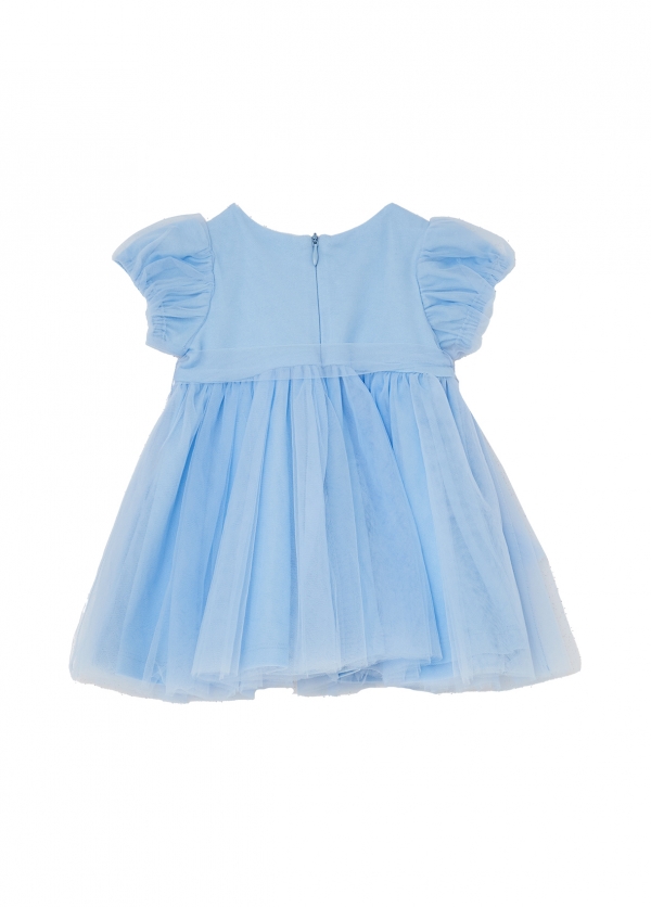 Abitino morbido per neonata in tulle colore celeste compreso di fascia in tulle Liu-Jo, cerniera sul retro.