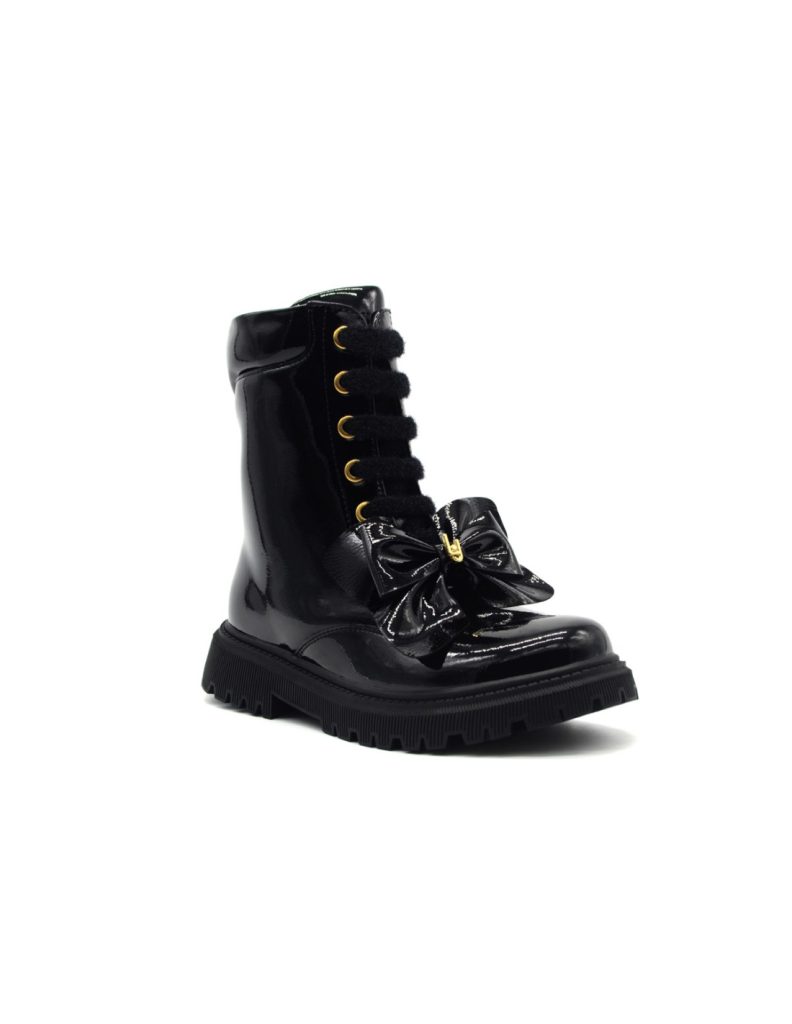 Anfibi  Bambina, in simil pelle color nero tinta unita. Dettaglio stella metallizzata color argento, logo nella parte laterale in contrasto. Fondo antiscivolo colo nero con stampa logo.Chiusura anteriore con lacci, chiusura laterale con zip.