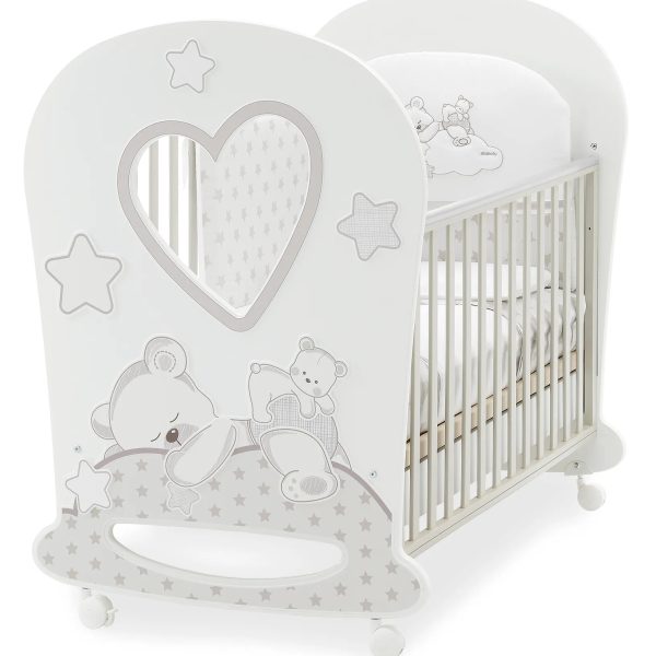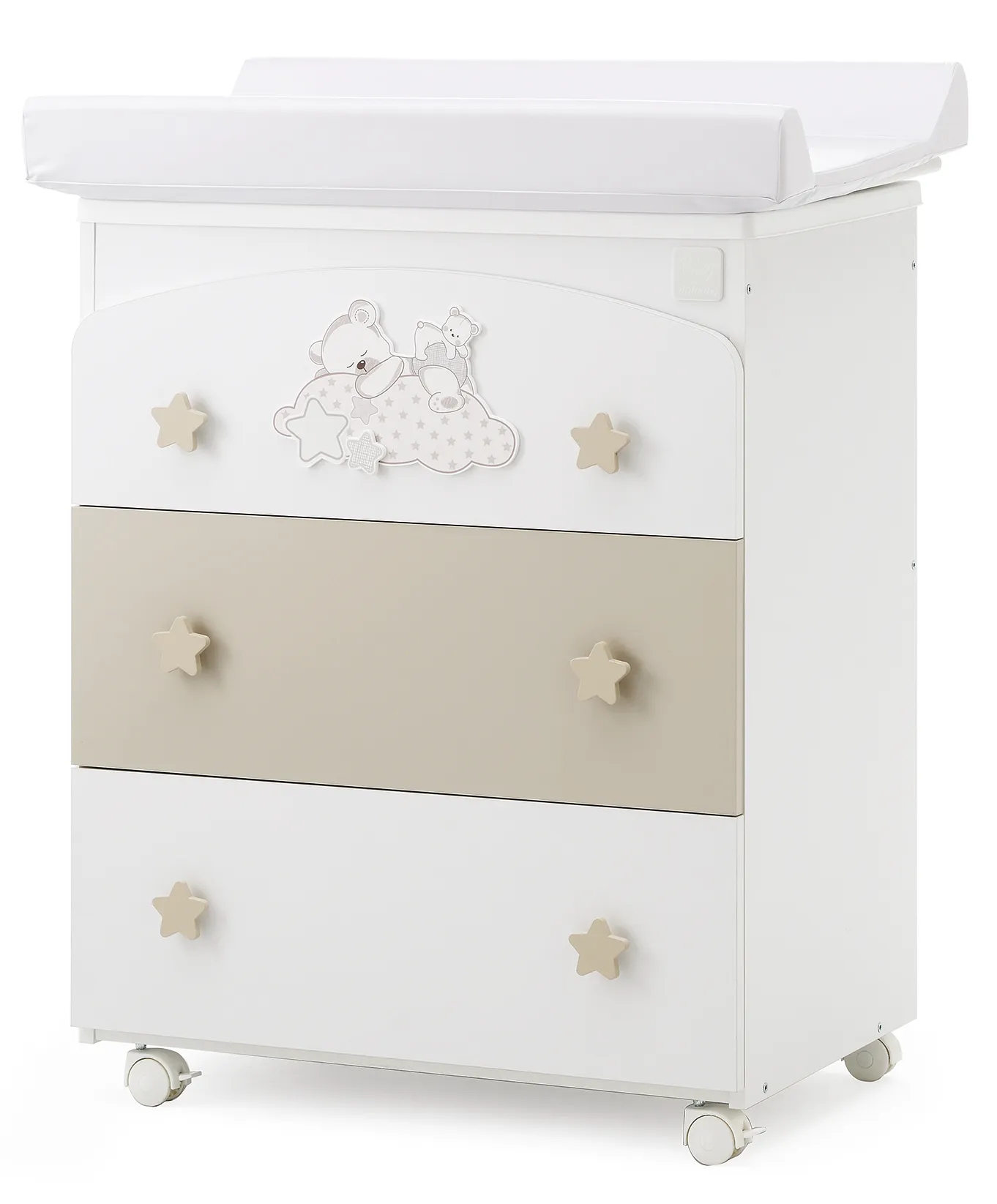Bagnetto 3 cassetti con piano fasciatoio ribaltabile con cerniera di sicurezza. La sua vaschetta ergonomica ed estraibile ha una doppia posizione:da un lato accoglie il neonato, mentre l’altro lato è caratterizzato da