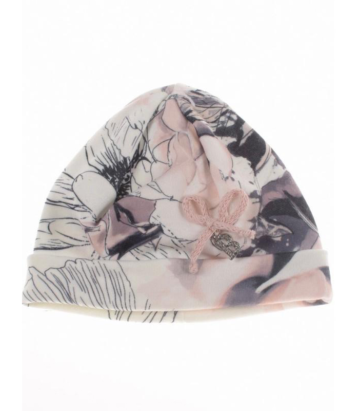 Bavaglino con stampa a fiori contornato da rouches in garza rosa. – Chiusura con laccetto.