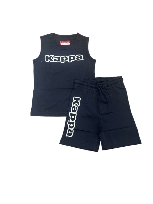 Completo corto da bambino in cotone composto da: canotta girocollo con stampa sul davanti; bermuda in coordinato con bordo elastico in vita e coulisse regolabile.