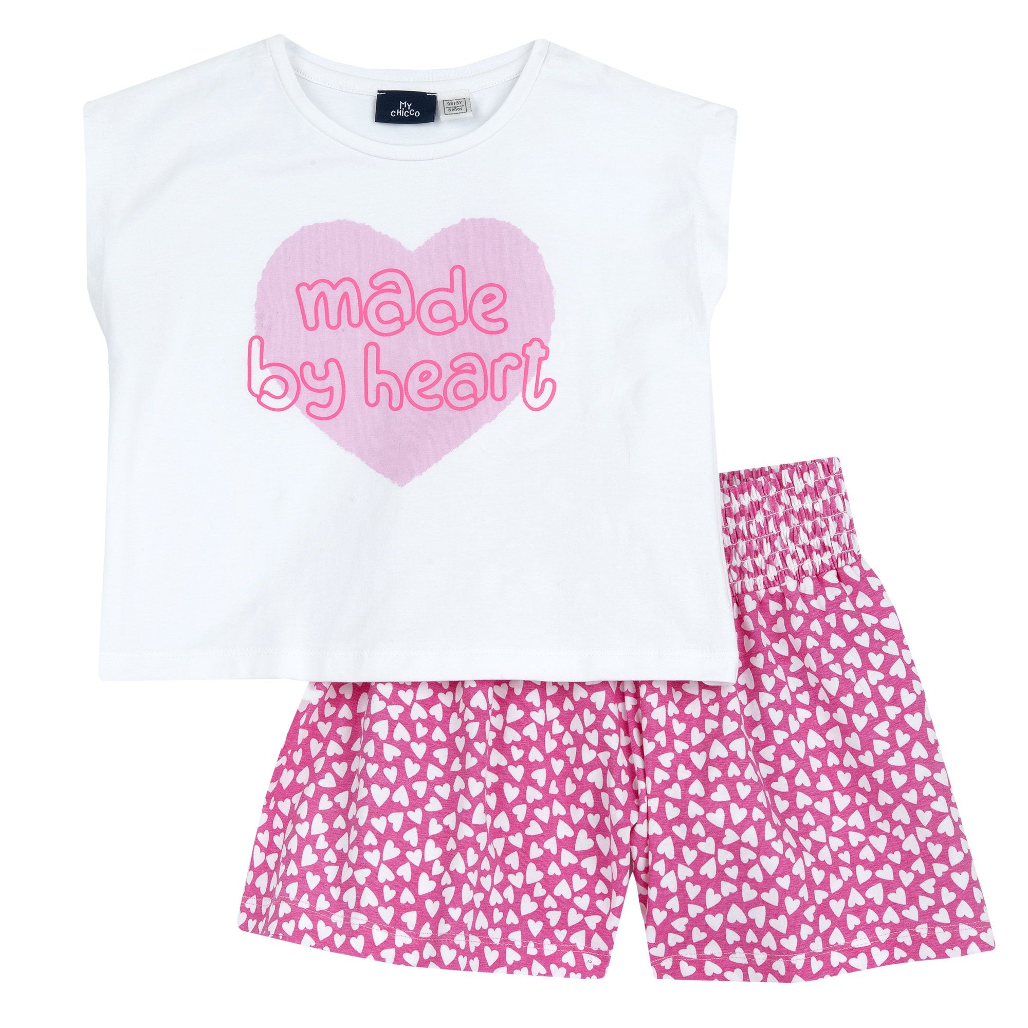 Completo CHICCO in cotone composto da t-shirt con stampa applicata in colore a contrasto, e shorts a fantasia cuori con elastico in vita.
