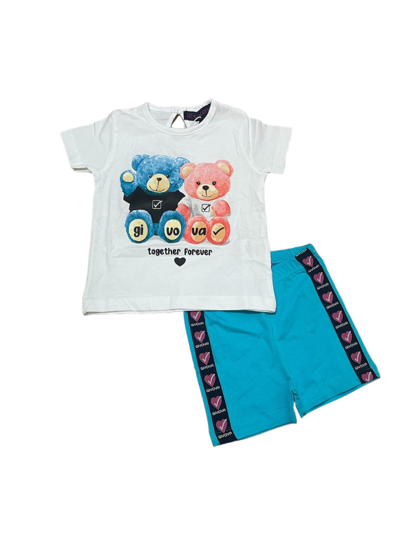 Completo sportivo 2 pezzi da bambino composto da: t-shirt in cotone girocollo, manica corta, stampa scritta e logo marchio sul davanti e sulle maniche; bermuda in coordinato, tinta unita.