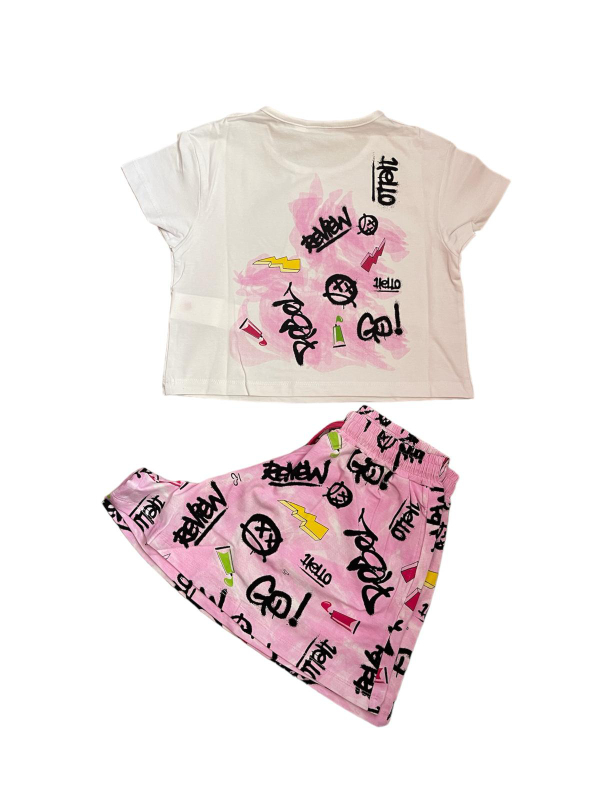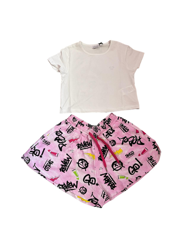 Completino Sarabanda per bambina realizzato in jersey 100% cotone. La t-shirt รจ bianca con logo glitter e stampa dietro come Shorts. Pantalone corto rosa con elastico in vita e couliise a contrasto colore.