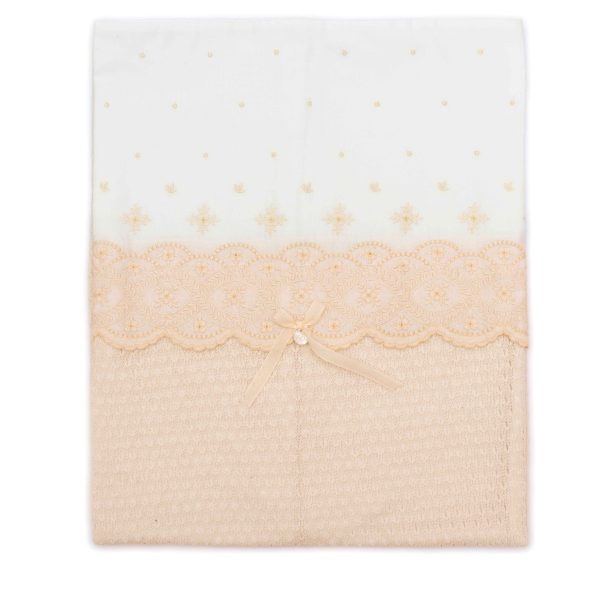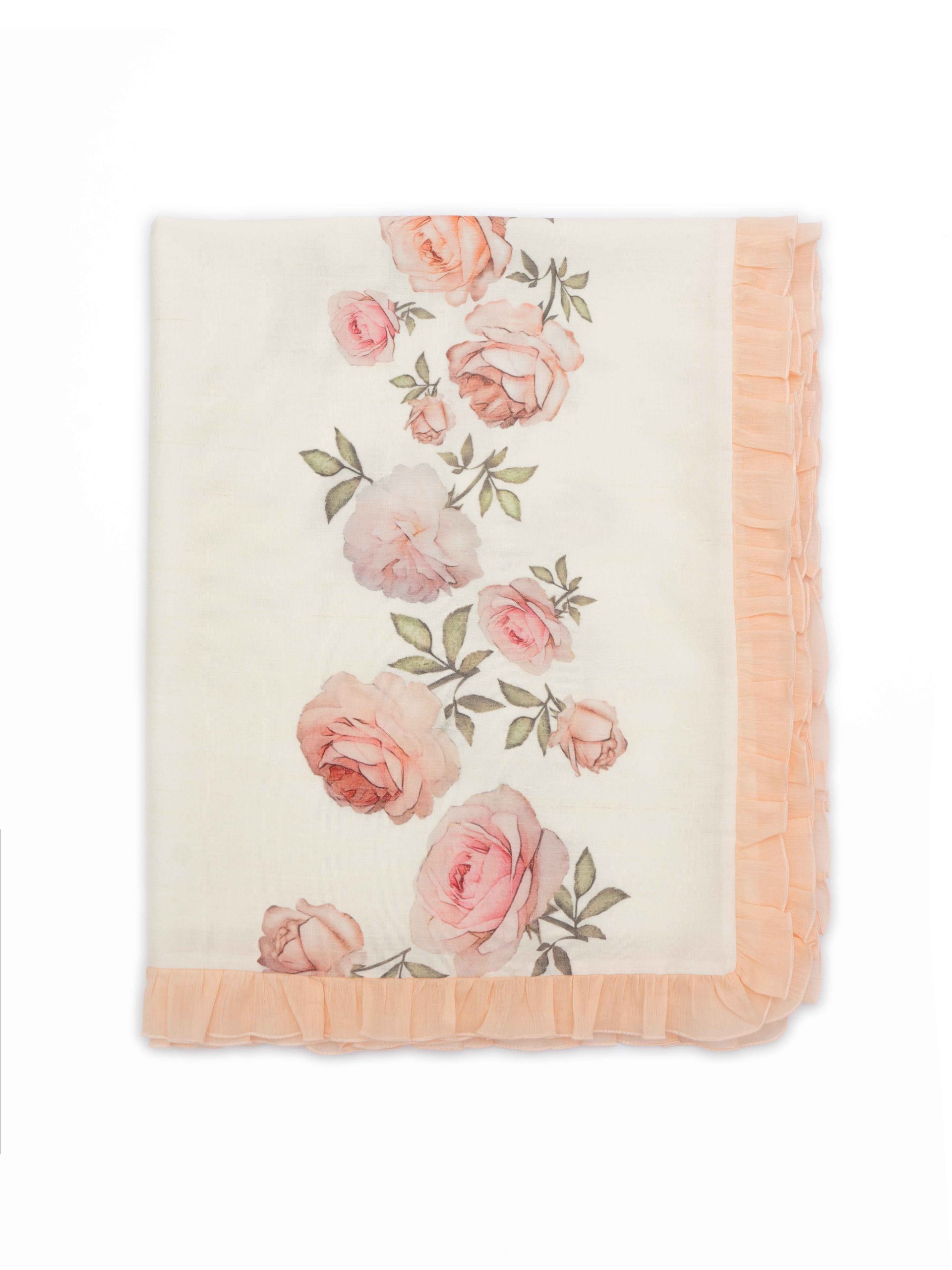 Coperta sfoderabile con stampa a fiori e rouches perimetrali rosa. – Fodera in cotone sul retro. – Apertura con bottoncini a pressione logati. – IMBOTTITURA NON INCLUSA – Dimensioni: 85x70cm