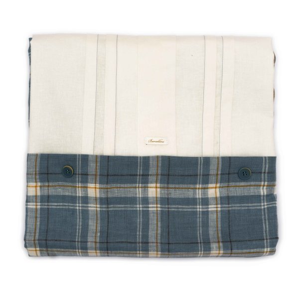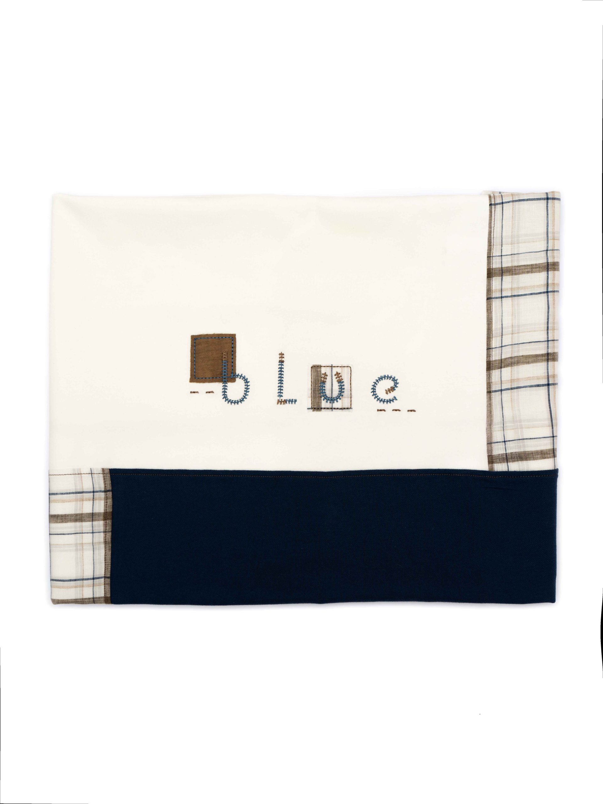 Coperta sfoderabile in jersey elasticizzato bianco nella parte superiore e piquet blu con lino a quadri latte/marrone nella parte inferiore. – Fodera in cotone sul retro. – Apertura con bottoncini a pressione logati. – IMBOTTITURA NON INCLUSA – Dimensioni: 85x70cm