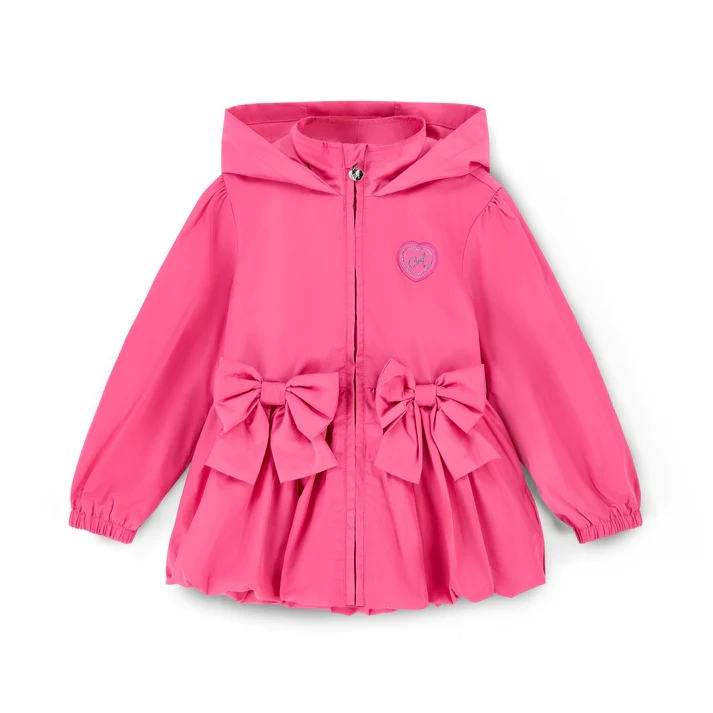 La giacca Stella Realizzata in tessuto  setoso, presenta un orlo a sbuffo, due fiocchi applicati sul davanti e uno su ogni manica. Rifinita con una zip con strass