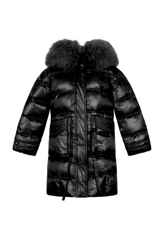 Giubbotto in nylon con impuntura e trapunta . Collo in pelliccia sintetica amovibile. Chiusura frontale con cerniera. Tasca anteriori funzonali con patta e spille logo.