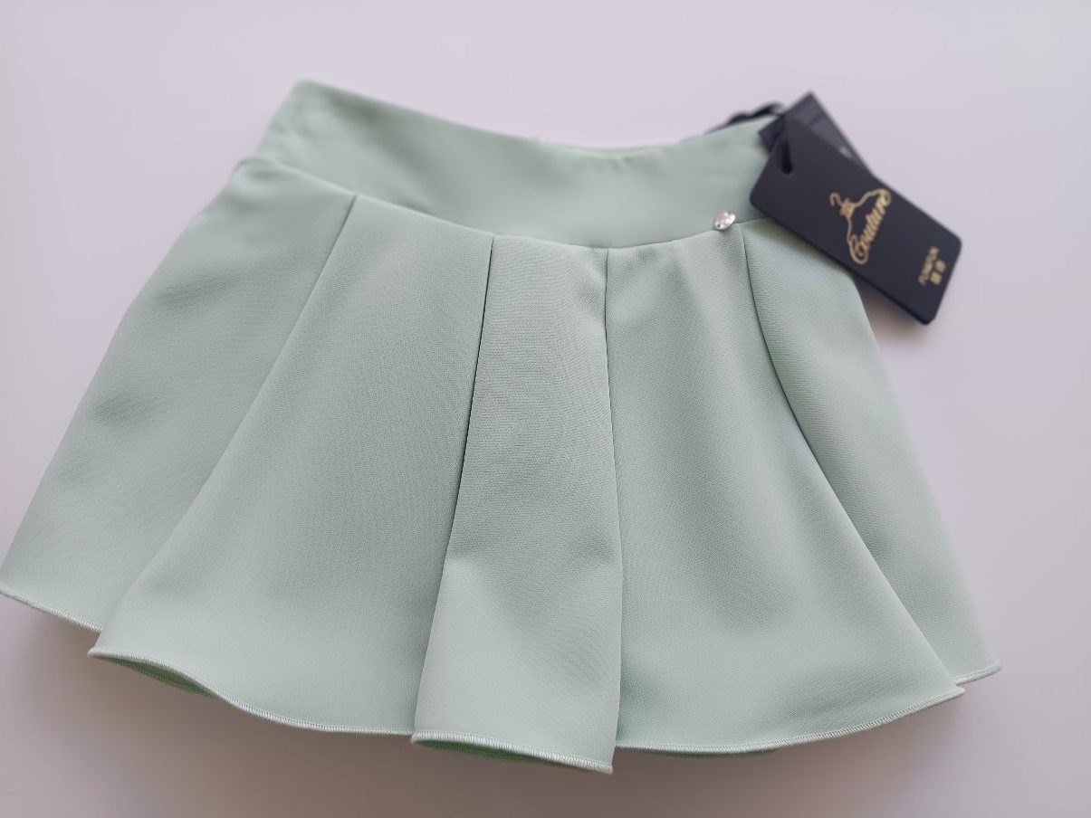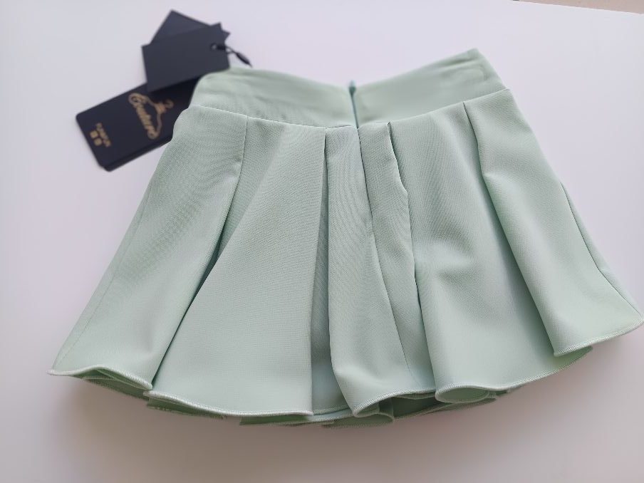 Gonna corta colore verde menta con pieghe e cerniera sul retro, abbinata a giacca corta colore menta Fun fun couture