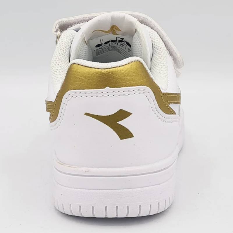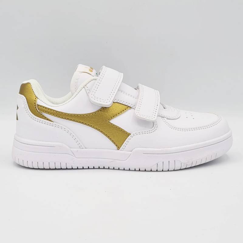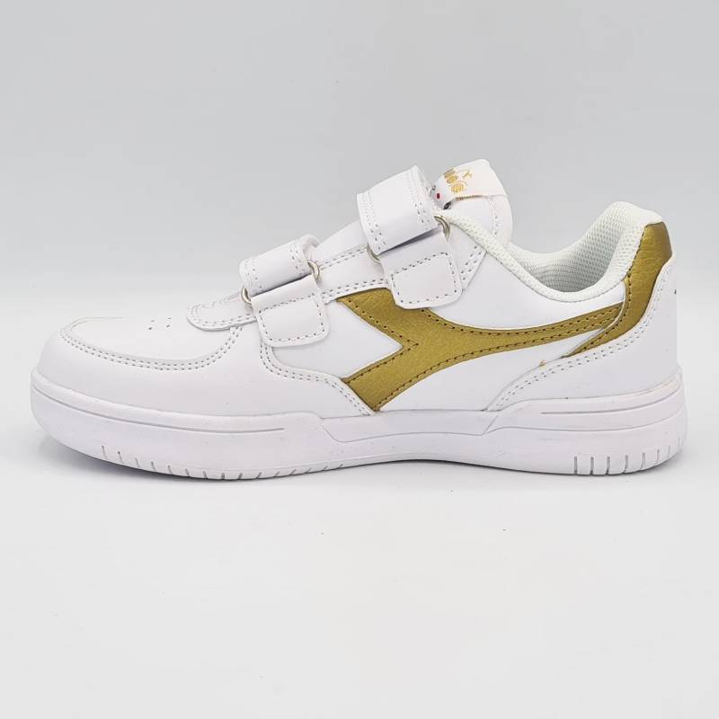 DIADORA RAPTOR LOW PS   Sneakers per bambini/e in pelle sintetica con chiusura a zip. Il modello Raptor Low PS, come il corrispettivo da adulto, si arrichisce del fregio a contraste e del collarino in tessuto.  Tomaia: Materiale sintetico Plantare fisso non estraibile Suole TPR Lacci poliestere Chiusura strap in velcro    Colore: White/Gold