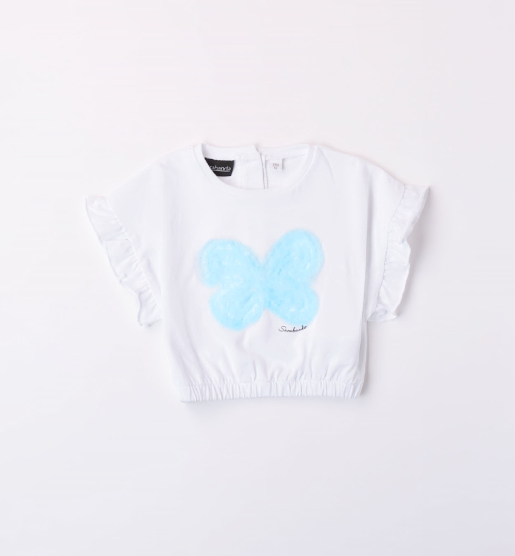T-shirt ragazza Sarabanda realizzata in jersey stretch di cotone. Il modello รจ in fantasia tinta unita con stampa farfalla davanti ed elastico sul fondo.