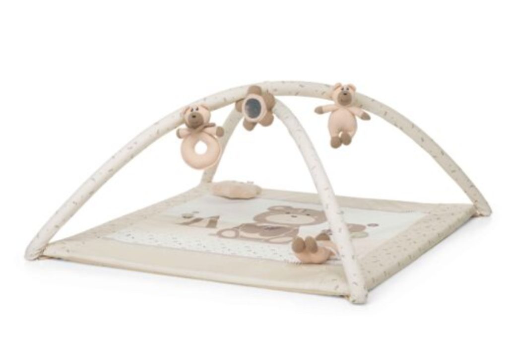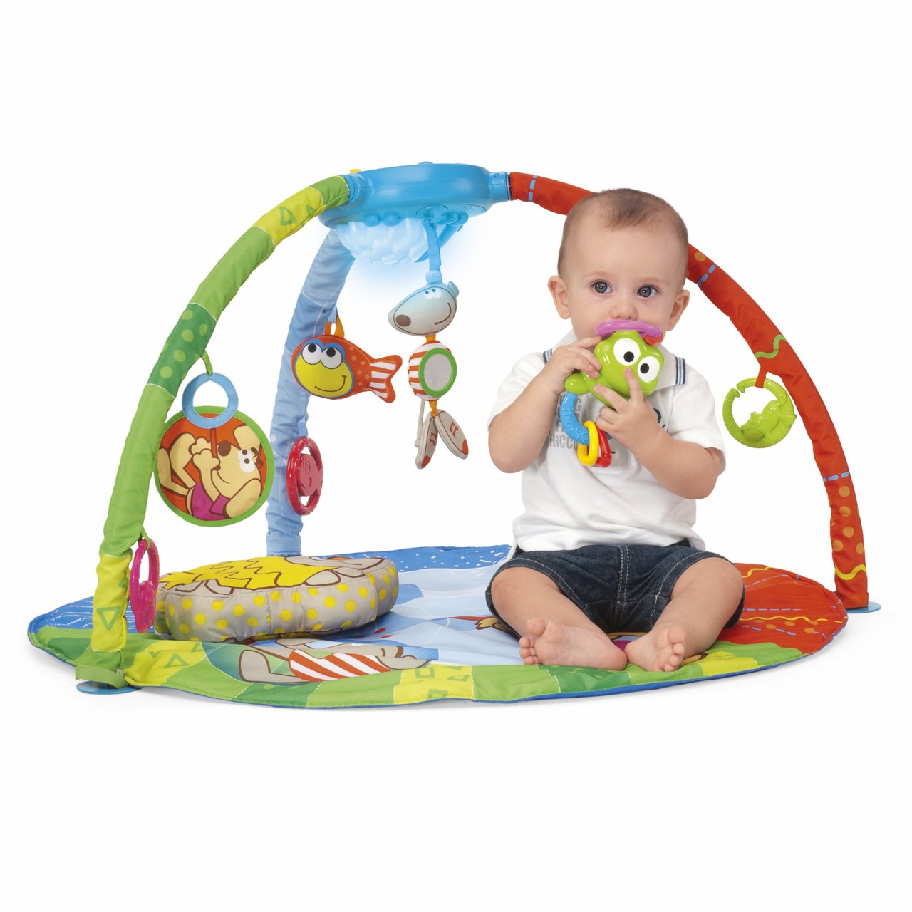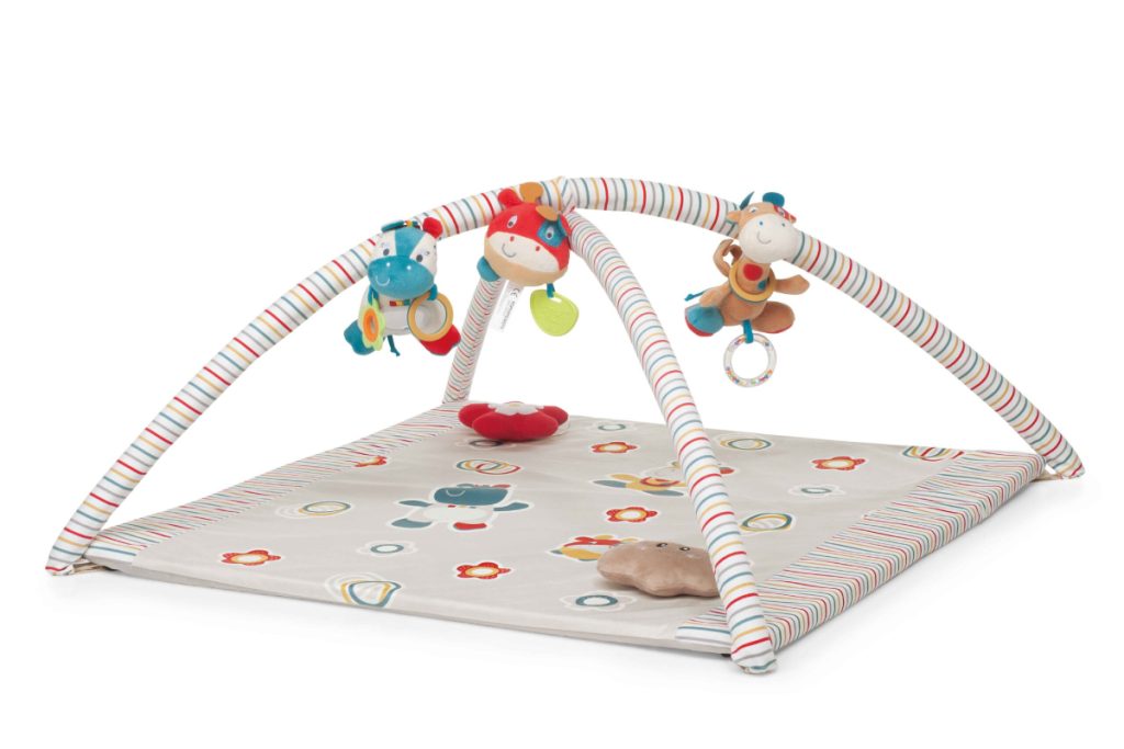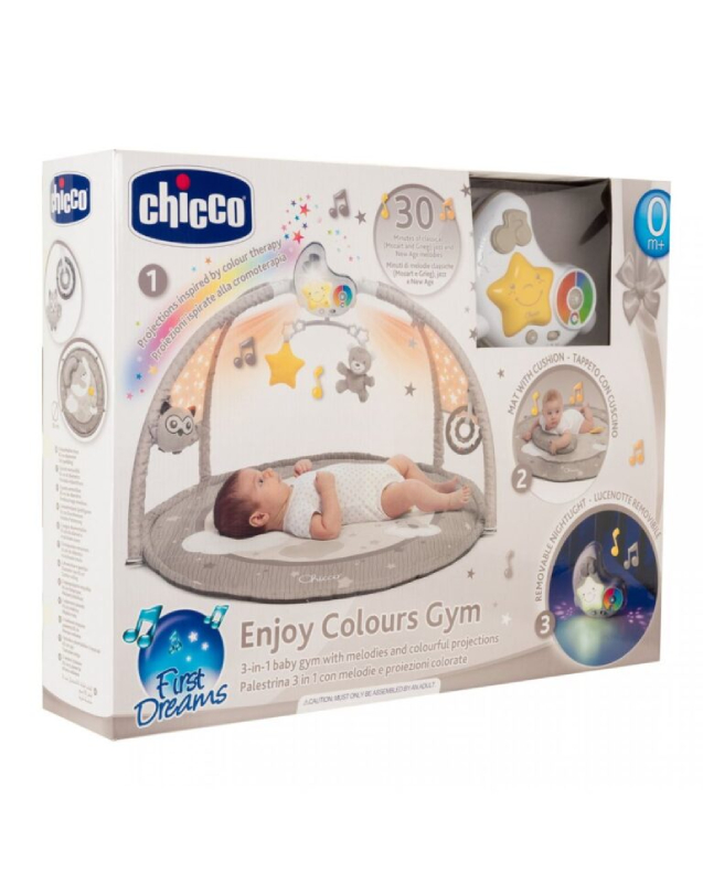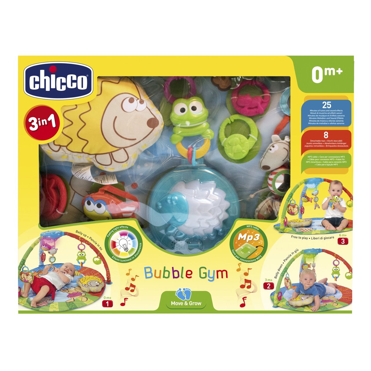• Chicco Bubble Gym è dotata di un tappeto imbottito di grandi dimensioni e dai colori brillanti, un morbido cuscino e 3 archi gioco con pannello elettronico con cui personalizzare musiche, suoni ed effetti luminosi
