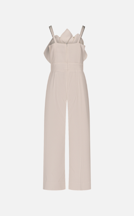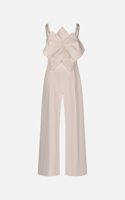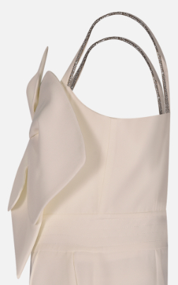Tutina in tessuto tecnico lunga. Scollo dritto e senza maniche. Dettaglio frontale di fiore applicato in tessuto in tono . Bretelle regolabili con strass. Chiusura posteriore con zip.