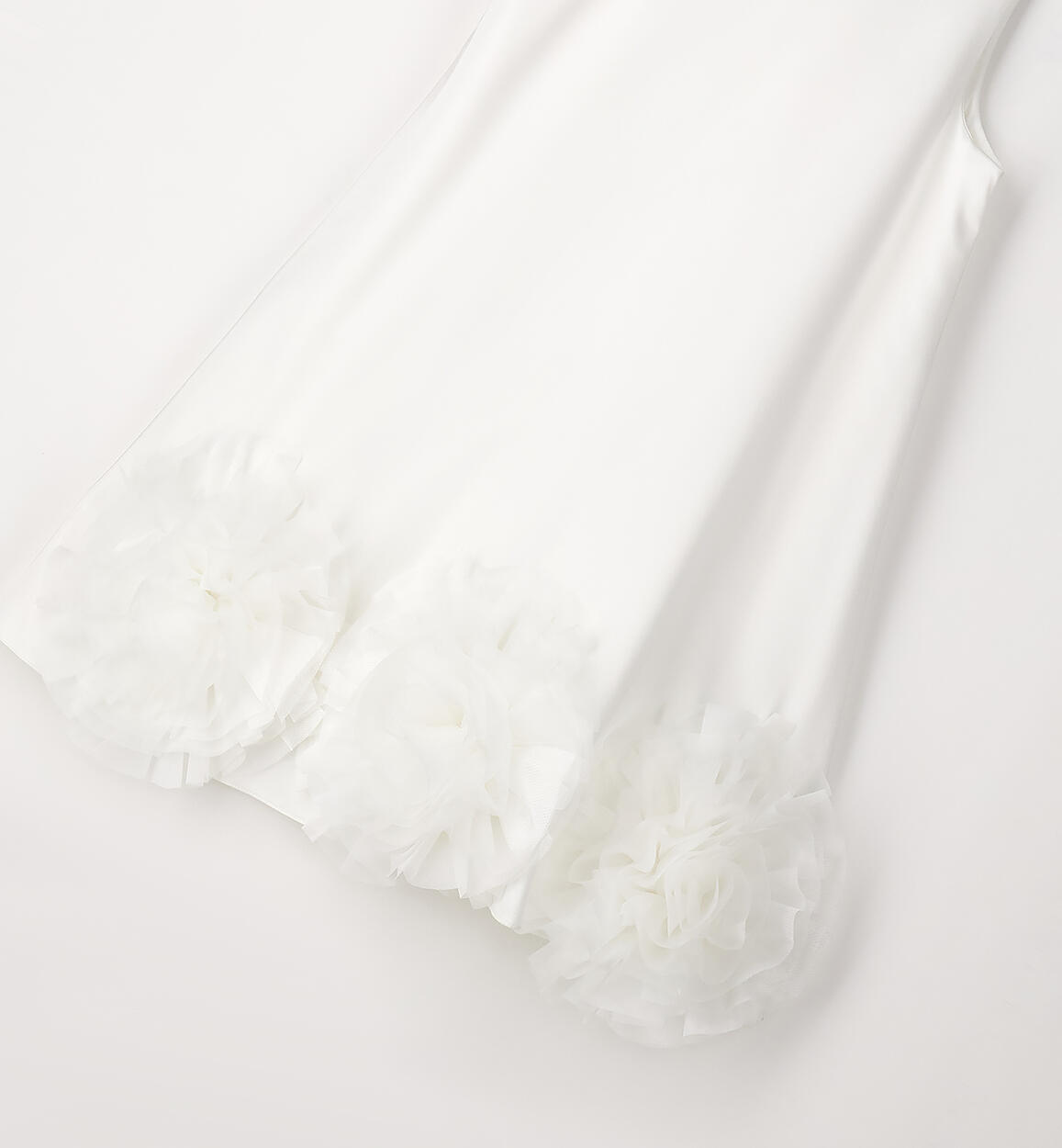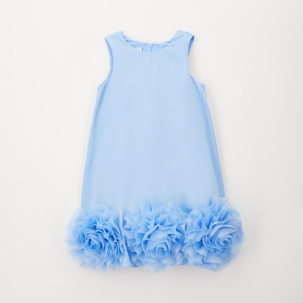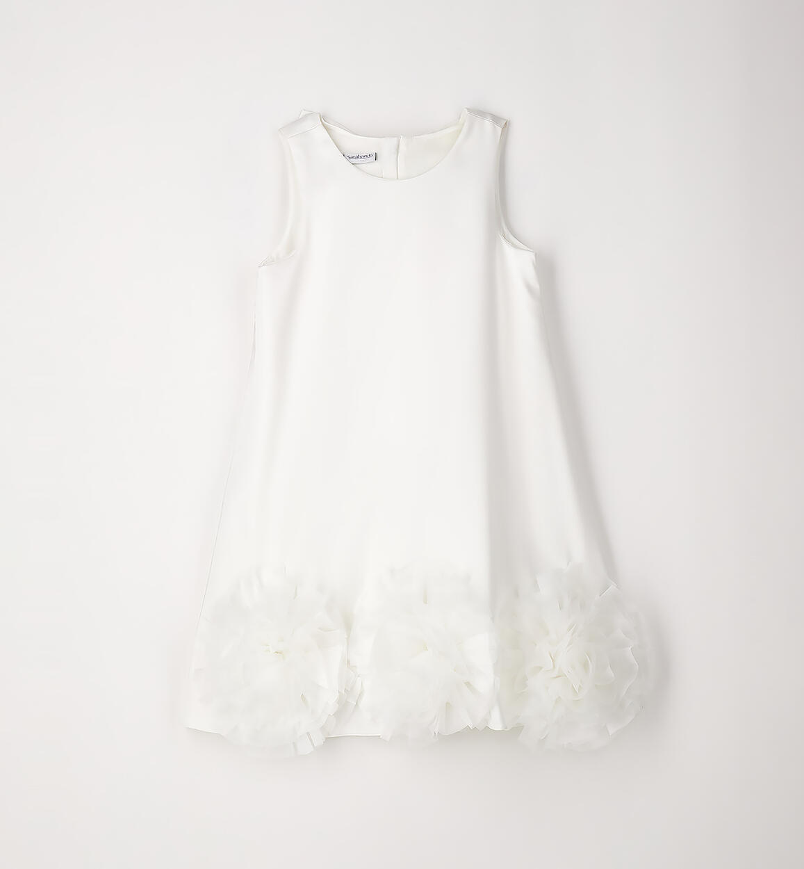 Abito elegante per ragazza Sarabanda realizzato in satin con applicazione sul fondo in organza. Inserto in tulle nel sotto gonna. Fodera in cotone. Apertura dietro con zip invisibile e fiocco dietro. Lunghezza sopra al ginocchio. Il modello fa parte della collezione Sarabanda Premium pensata per vestire le cerimonie più formali
